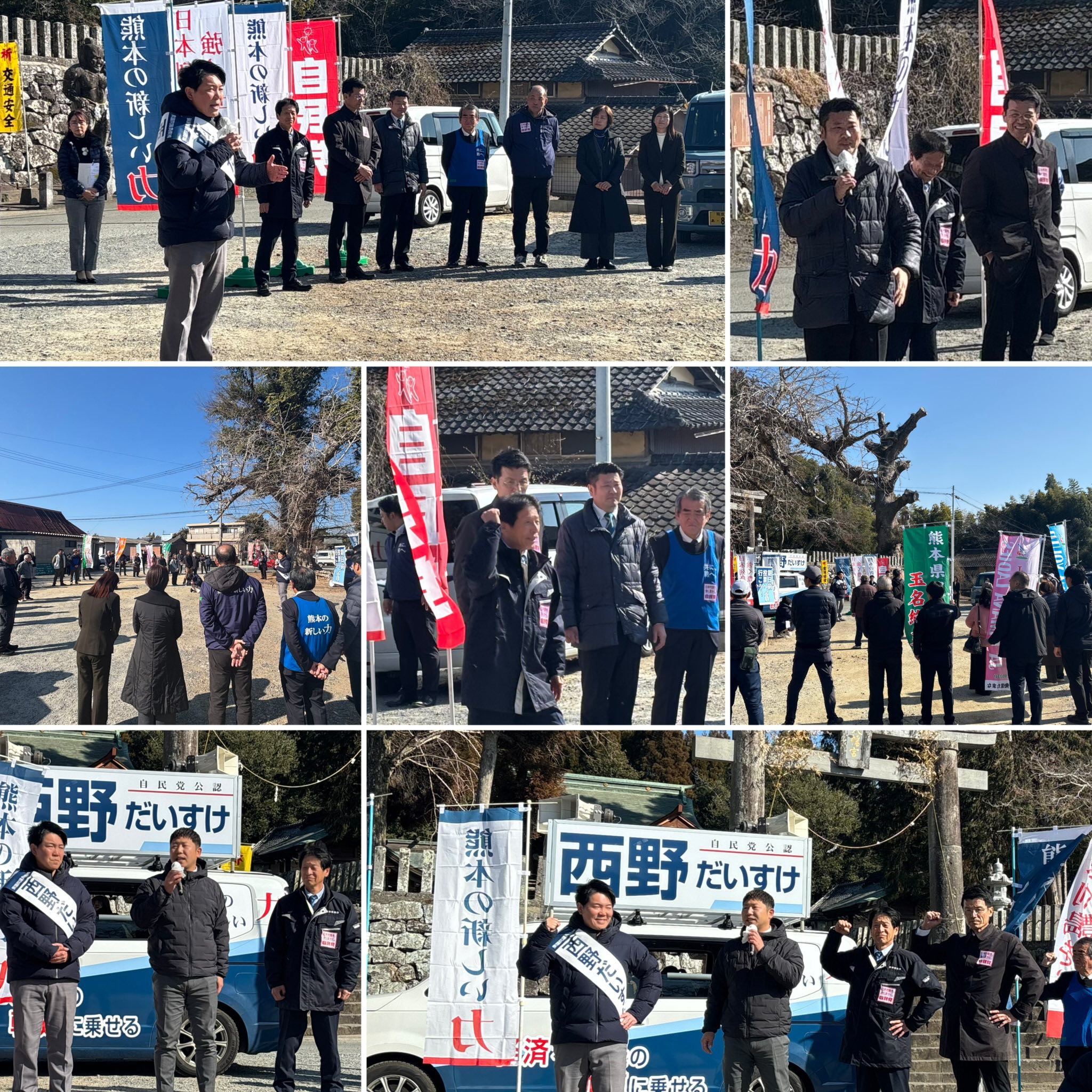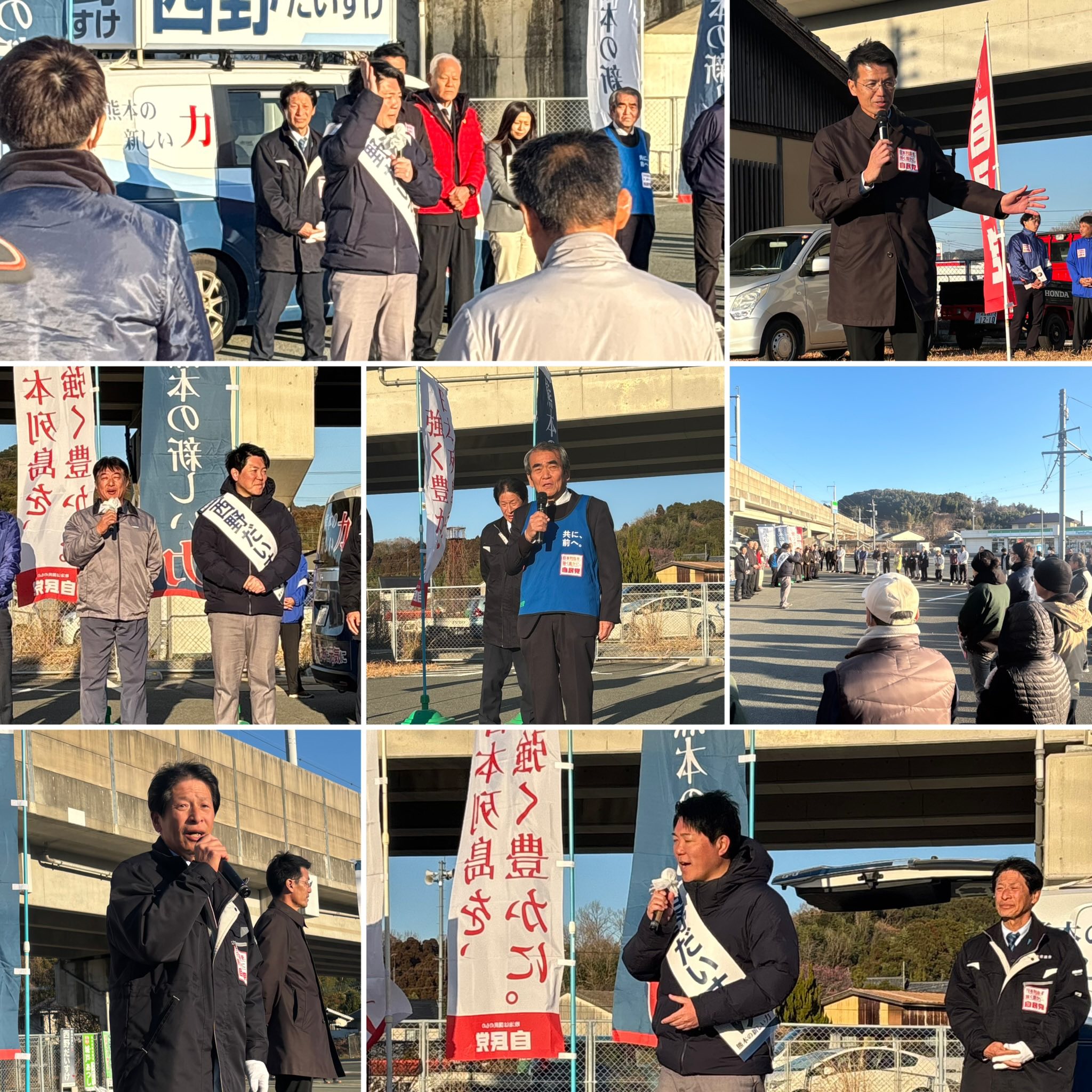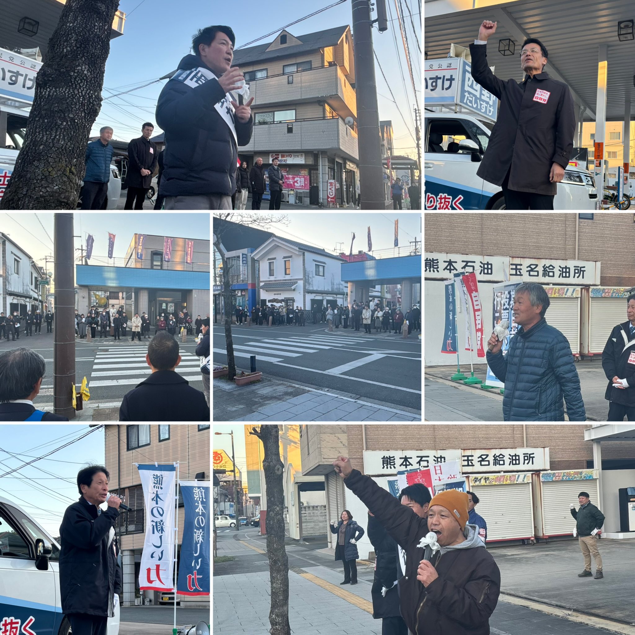 2月3日(火)、13時よりJAたまな本所にて街頭演説会を行い、玉南校区へ。伊倉南八幡宮、風の丘、さくら苑、岱明運輸新玉名倉庫、玉名大神宮、無岐乃古(むぎのこ)にて演説会が実施され、たくさんの方にお集まりいただきました。