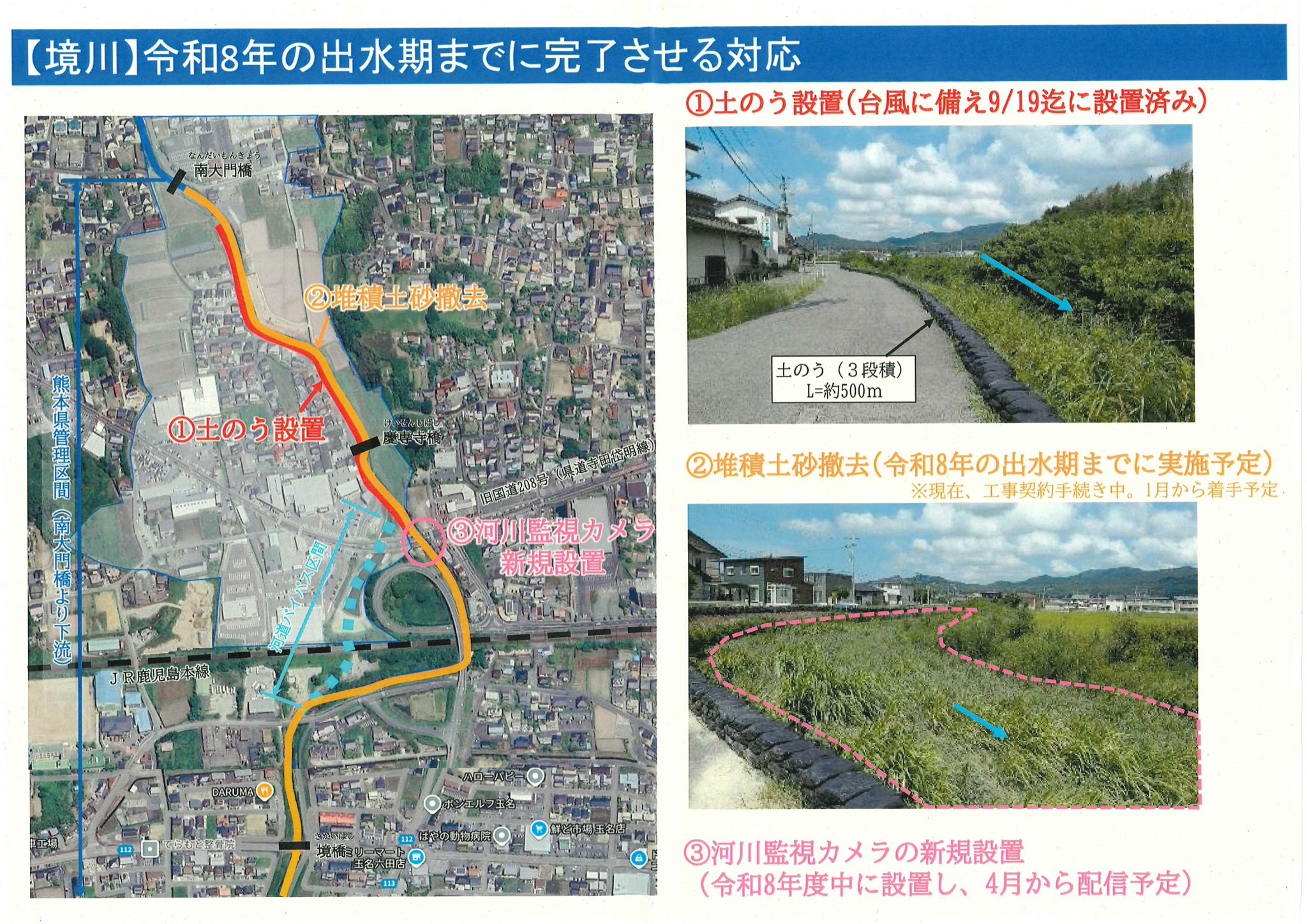 次期出水期までの対応としては、土のう設置に加えて、河川内の堆積土砂の撤去を実施(1月着手予定)。また、河川監視カメラを令和8年度中に新規設置し、4月から配信予定。