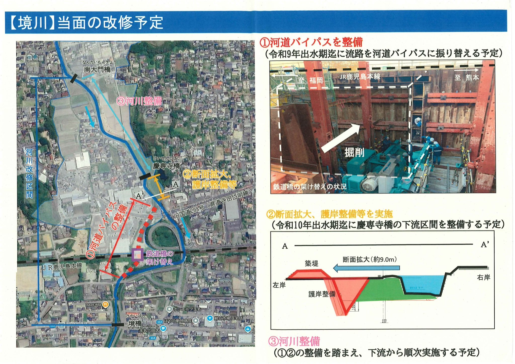 河川改修は、令和9年出水期までに河道バイパスを整備し、流路を振り替える予定。また、令和10年出水期までに慶専寺橋の下流区間の断面拡大・護岸整備を実施予定。その後も下流から南大門橋まで順次実施予定です。