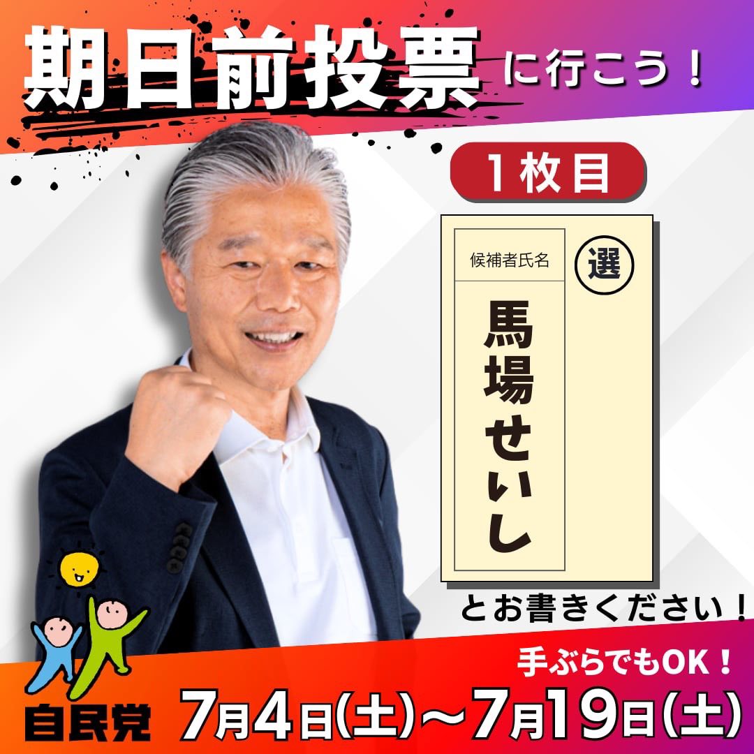 7月20日(日)にご予定のある方はぜひ、期日前投票をご活用いただきたいと思います。馬場せいし候補へのご支援よろしくお願い申し上げます。