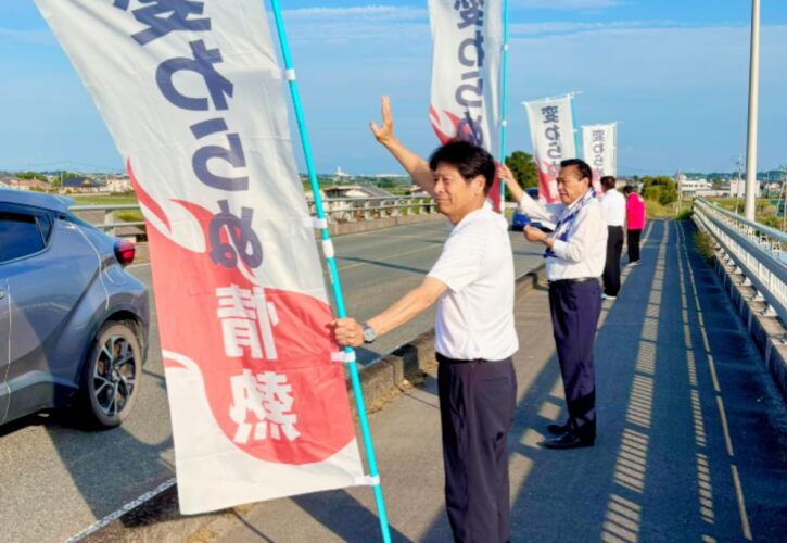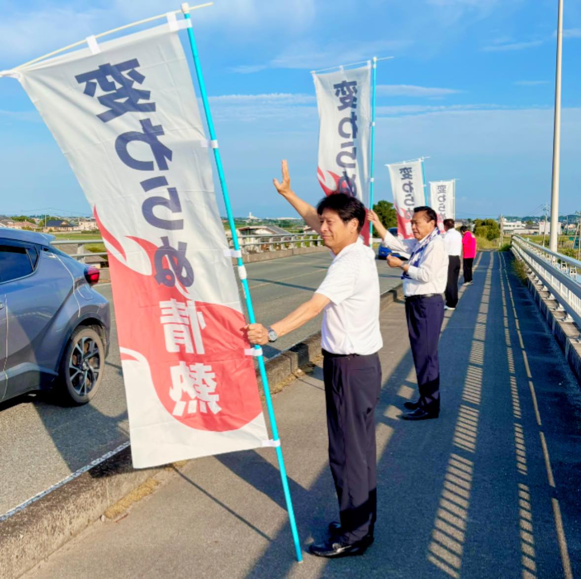 7月16日(水)、馬場せいし候補の必勝に向けて「チーム玉名」で辻立ちを行いました。朝7時からたくさんの通勤中の車が通る新大浜橋。クラクションなど激励してくださった皆さま、ありがとうございました!