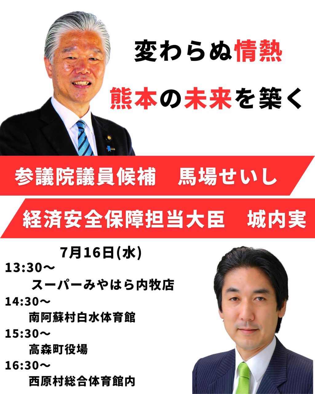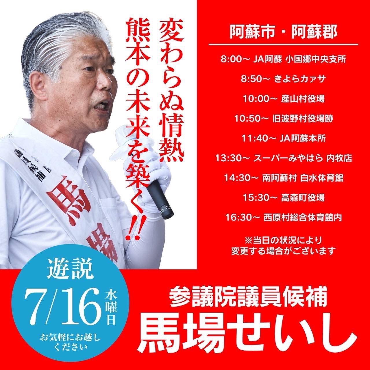 今日は馬場せいし候補は阿蘇市・阿蘇郡を遊説予定。午後から経済安全保障担当大臣が応援弁士として来られます。参院選14日目も「変わらぬ情熱」で活動して参ります!